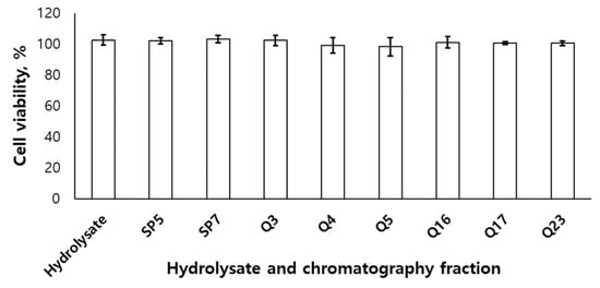 The cytotoxicity of hydrolysate and each fraction was measured at murine macrophage cell line RAW 264.7 (KCLB, Seoul, Korea) by the MTS assay described previously [41]. Cell viability is calculated by the following equation: cell viability (%) = (1 − At/Ac) × 100, where At is the sample treated absorbance and Ac is the absorbance of the non-treated control.