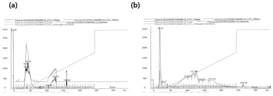 Solubility is an important factor in determining the reasonable sample amount for the application of chromatography. Solubilities of hydrolysate at 25 mM sodium citrate (pH 5.5) and 25 mM Tris-Cl (pH 8.0) were significantly decreased with the increase of the hydrolysate concentration by 40 mg/mL hydrolysate (p < 0.05), but were not the difference between pH 5.5 and pH 8.0 at 50 mg/mL. About 30% of hydrolysate was soluble at 50 mg/mL (Figure 1a). The solubility on pH of U. australis hydrolysate did not change in the range of pH 5.0~12 significantly, but greatly decreased below pH 4.5 (Figure 1b, p < 0.05 and p < 0.01).