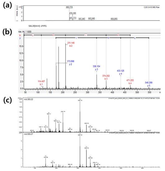 A typical mass spectrum of MALDI-TOF of NRDY (a), Q-TOF/MS/MS of LPYPG (b), and Q-TOF/MS/MS product ions of compounds presumed to be glycopeptide (c) for identification of peptides sequence and glycopeptide from the hydrolysate of Ulva australis.