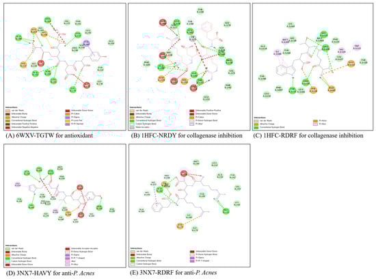 The reasonable docked conformations were selected based on cluster analysis and the Gold fitness score. FDPL, NRDY, and TGTW for antioxidant, NRDY and RDRF for collagenase inhibitor, and FDPL, HAVY, NRDY and RDRF for antibacterial effect were screened for in vitro validation based on molecular docking. The cluster number from 50 trials was 13 for TGTW as an antioxidant, 29 and 26 for NRDY and RDRF as a collagenase inhibitor, and 37 and 23 for HAVY and RDRF as an antibacterial effect, respectively. The Gold scores of peptides were in the range of 83.3–100.5 (Table 4).