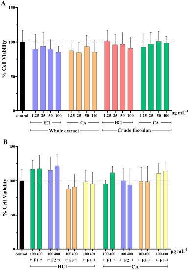 Overall, the majority of extracts reduced slightly cell viability compared to the control (Figure 1A). The lowest value of viability was 84.9% and it was observed when cells were treated with the whole CA extract at a concentration of 25 μg mL−1. Exceptions were the cells treated with crude HCl fucoidan fraction at 1.25 μg mL−1 and crude CA fucoidan fraction at 50 μg mL−1, which resulted in values of cell viability of around 101%. However, when comparing the viability values of the treated and untreated cells, no significant differences were found for any of the concentrations tested.
