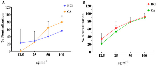 Effect of the concentration of (A) whole extracts and (B) crude fucoidan extracted with CA or HCl from algae samples on their neutralization activity against bovine RV WC3 infection of MA104 cells. Results are shown as mean ± standard deviation of duplicates from four independent experiments (n = 8). Significant differences between the means of same concentrations are indicated with * p < 0.05.