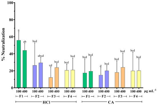 Effect of MWCO fractionation on the neutralizing activity of whole extracts from F. vesiculosus against bovine RV WC3 strain infection of MA104 cells. F1: Fraction > 300 kDa, F2: Fraction < 300 kDa, F3: Fraction < 100 kDa, F4: Fraction < 10 kDa, HCl: hydrochloric acid 0.1 M, CA: citric acid solution 1% w/v of duplicates from three independent experiments (n = 6). Superscript letters (a, b, c, and d) express statistical significance for p < 0.05 or higher.