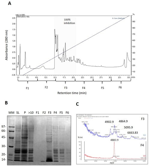 Subsequently, the venom of A. cascaia was fractionated using RP-HPLC to track serine peptidase inhibitors. As shown in Figure 2A, the chromatographic profile of the venom was divided into six fractions (F1 to F6), and the majority of venom components eluted between 30% and 60% B (15 to 22 min), mainly corresponding to F3. The fractions were assayed for trypsin inhibition and analyzed by SDS-PAGE and MALDI-TOF (Figure 2B,C). Only F3 and F4 exhibited the presence of serine peptidase inhibitors. F3 showed complete inhibition of trypsin, and SDS-PAGE revealed that the majority of the components were 14 and 20 kDa (Figure 2B). MALDI-TOF analysis of F3 revealed the presence of ions with m/z 4864, 4902, 5095, and 6663 corresponding to the most abundant ions (Figure 2C). As F3 exhibited the greatest response in the trypsin inhibition assay, F3 was chosen for further purification of potential serine peptidase inhibitors (Figure S2A).