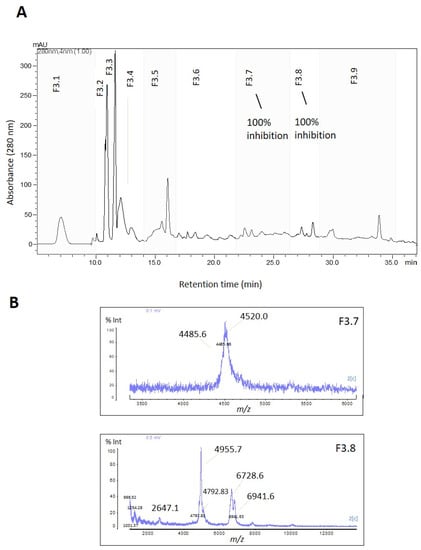 (A) Reversed-phase chromatographic separation of Fraction 3 from A. cascaia’s venom. The inhibitory fraction was separated by RP-HPLC using a C18 column and a gradient of 5–40% of B in 40 min, leading to the obtention of 9 fractions (3.1 to 3.9). The fractions were tested regarding trypsin inhibition, and F3.7 and F3.8 exhibited 100% enzyme activity inhibition. (B) MALDI-TOF analysis of inhibitory fractions (3.7 and 3.8) from A. cascaia venom. Fraction 3.7 shows mainly the existence of two components, m/z 4520 and m/z 4485, and F3.8 shows m/z ranging from 2647 to 6941.