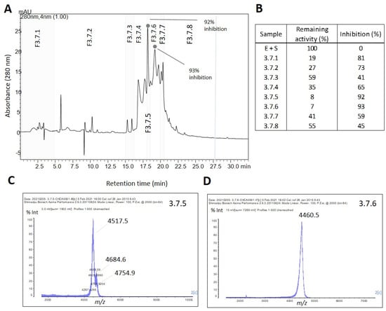 (A) Reversed-phase chromatographic separation of Fraction 3.7 from A. cascaia’s venom. The fraction was separated by RP-HPLC using a C18 column and a gradient of 5–60% of B in 35 min. The separation led to the obtention of 8 fractions (3.7.1 to 3.7.8) that were subsequently tested regarding trypsin inhibition. F3.7.5 and F3.7.6 presented more than 90% of activity inhibition. (B) Trypsin inhibition assay. F3.7 subfractions (5 µL) were incubated for 30 min with trypsin (1:1), and afterward substrate was added to the samples. Substrate consumption in Arbitrary Units of Fluorescence (Y axis) was read every 5 min for 35 min (X axis). In the test, samples F3.7.1 to F3.7.8 representing venom fractions from A. cascaia, Blank (B + S), and positive control (E + S) were analyzed. B = Buffer, S = Substrate, and E = Enzyme. The subfractions F3.7.5 and 3.7.6 exhibited the highest enzyme inhibition (>90%), reflecting lower substrate consumption over time. (C,D) MALDI-TOF analysis of A. cascaia venom fractions. The spectra of F3.7.5 (C) by positive mode show the existence of three main components: m/z 4518, m/z 4685, and m/z 4755. Fraction 3.7.6 (D) shows the presence of a unique peptide of m/z 4461.