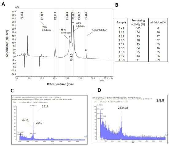 (A) Reversed-phase chromatographic separation of Fraction 3.8 from A. cascaia’s venom. The fraction was separated by RP-HPLC using a C18 column and a gradient of 5–60% of B in 35 min. The separation led to the obtention of 8 fractions (3.8.1 to 3.8.8). Fractions exhibiting trypsin inhibition are highlighted with a symbol (°) above the peaks. (B) Trypsin inhibition assay. F3.8 subfractions (5 µL) were incubated for 30 min with trypsin (1:1), and substrate was added to the samples afterward. Substrate consumption in Arbitrary Units of Fluorescence (Y axis) was read every 5 min for 35 min (X axis). In the test, samples F3.8.1 to F3.8.8 representing venom fractions from A. cascaia, Blank (B + S), and positive control (E + S) were analyzed. B = Buffer, S = Substrate, and E = Enzyme. F3.8.4, F3.8.6, and 3.8.8 exhibited the highest enzyme inhibition, reflecting lower substrate consumption over time. (C,D) MALDI-TOF analysis of A. cascaia venom fractions. (C) The spectra of F3.8.4 by positive linear mode shows the existence of m/z 2617, 2633 and 2649. (D) Fraction 3.8.8 shows the presence of a main mass of m/z 2634.3.