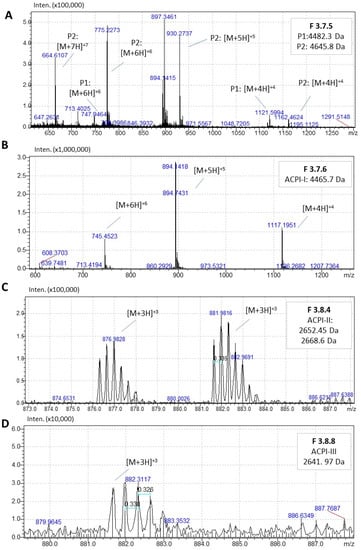 LC-MS analysis provided a comprehensive mass profile of the serine peptidase inhibitors isolated from the venom fractions. Figure 6 depicts the mass spectra of peptides obtained by LC-MS analysis for each inhibitory fraction. Notably, F3.7.6 presented a distinct peptide with a mass of 4465.70 ± 0.16 Da corresponding to ACPI-I, while F3.8.4 exhibited 2652.45 Da and 2668.60 Da peptides likely corresponding to the same peptide (ACPI-II) with a mass difference of 16 m/z; F3.8.8 displayed a peptide with a mass of 2641.97 Da (ACPI-III). F3.7.5 is the sole fraction that appears to contain two primary peptide inhibitors (4645.84 ± 0.16 Da and 4482.36 ± 0.16 Da).