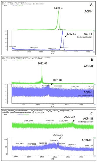 Identification of cysteines in ACPI-I (A), ACPI-II (B), and ACPI-III (C) peptides by MALDI-TOF. Isolated peptides were reduced using DTT and alkylated by Iodoacetamide, presenting an increase of +57 Da per cysteine found in the sample. Each spectrum shows the intact peptide m/z (green color) and the respective m/z post modification of cysteines. (A) Shows a mass difference of 342 in ACPI-I post modification (blue spectrum), signalizing the existence of 6 cysteines in this peptide. (B) Shows a mass increase of m/z 228 in ACPI-II (blue spectrum), revealing 4 cysteines in ACPI-II. (C) Shows the intact mass of ACPI-III m/z (blue color) and the respective m/z post modification of cysteines (green color). This figure shows a mass increase of 277 in ACPI-III, presenting at least 4 cysteines in this peptide.