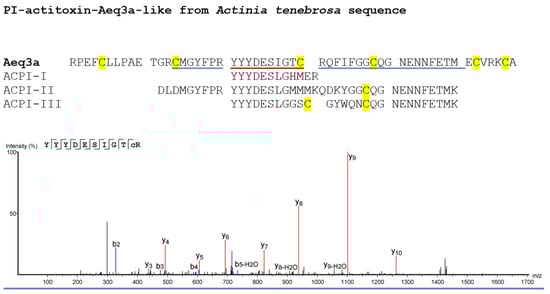 Coverage of Blastp hit PI-actitoxin-Aeq3a-like and De novo peptides identified in ACPI-I, ACPI-II, and ACPI-III. The figure shows the amino acid (aa) sequence of PI-actitoxin-Aeq3a-like from A. tenebrosa. Peptides identified by LC-MS/MS are highlighted in blue and red. The m/z corresponding to the sequence ‘YYYDESIGTC’ (highlighted in red) was identified in all three purified peptides (ACPI-I, ACPI-II, and ACPI-III) as seen in Figures S3–S5. The respective mass spectrum from this aa sequence is shown below the sequences, exhibiting y and b ions distribution. De Novo analysis based on the mass spectra acquired for each purified peptide (ACPI-I, ACPI-II, and ACPI-III) suggests new amino acid sequences that exhibit similarity to actitoxin-Aeq3a-like scaffold. The suggested de novo sequences are shown below Aeq3a-like toxin. Cysteine residues that characterize Kunitz domain are highlighted in yellow. Average Local Confidence percentages (ALC %) from De novo peptides are shown in Table S1, and Mass spectra are shown in Figure S6.