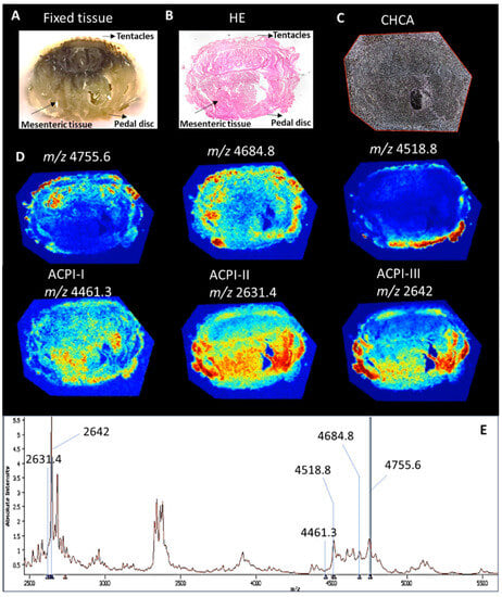 Previous studies have reported the use of MSI to detect the presence of Kunitz peptides in the mesenterial filaments of A. tenebrosa, and MALDI-MSI has been employed to elucidate the spatial distribution of κ-actitoxin-Ate1a in A. tenebrosa, as well as to localize peptide toxins in the sea anemone Oulactis muscosa [6,34,50,51]