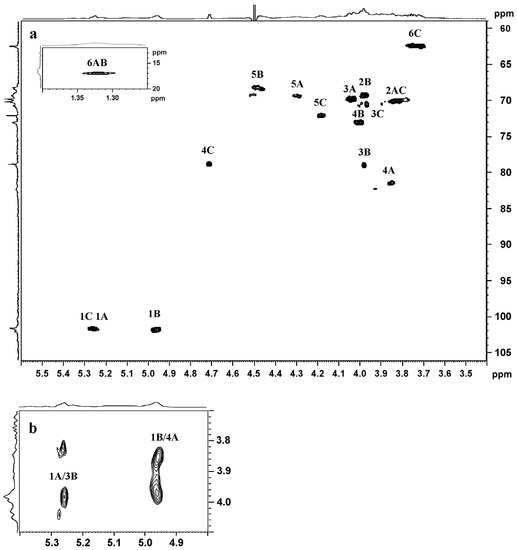 | B →3)-α-l-Fucp-(1→ | 101.8/4.97 | 69.3/3.97 | 79/3.98 | 73/4.0 | 68.4/4.48 | 16.9/1.32 |