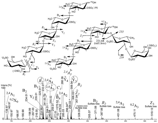 | 235.01 | [Fuc2(SO3Na)2 − 2Na − O + 18O]2− | 327.71 | [Fuc4Gal(SO3Na)3 − 3Na − H2O]3− |