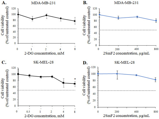 - Malyarenko, O.S.; Usoltseva, R.V.; Silchenko, A.S.; Zueva, A.O.; Ermakova, S.P. The combined metabolically oriented effect of fucoidan from the brown alga Saccharina cichorioides and its carboxymethylated derivative with 2-deoxy-d-glucose on human melanoma cells. Int. J. Mol. Sci. 2023, 24, 12050. [Google Scholar] [CrossRef] [PubMed]