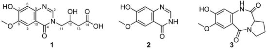 - Maskey, R.P.; Shaaban, M.; Grün-Wollny, I.; Laatsch, H. Quinazolin-4-one Derivatives from Streptomyces Isolates. J. Nat. Prod. 2004, 67, 1131–1134. [Google Scholar] [CrossRef]