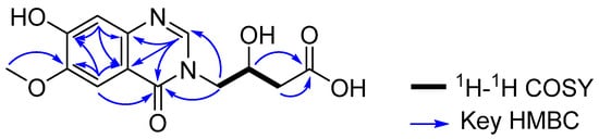 Additional 2D NMR analyses allowed the structure of 1 to be constructed. The quinazolin-4-one unit was assigned by the NMR signals of six aromatic carbons at δC 105.7 (C-5), 148.2 (C-6), 153.0 (C-7), 110.9 (C-8), 143.9 (C-9), and 113.8 (C-10), and two hetero-aromatic carbons at δC 147.1 (C-2) and 159.7 (C-4), along with the HMBC correlations from H-2 to C-4, C-9 and C-10; from H-5 to C-4, C-6, C-7 and C-10; and from H-8 to C-7, C-9 and C-10. In addition, HMBC correlations from 6-Ome to C-6 provided the attachment of the methoxy group at C-6. Furthermore, COSY cross peaks [H-11/H-12 and H-12/H-13] and long-range HMBC correlations of H-12 and H-13 with C-14 (δC 172.2) as well as the carbon chemical shift of C-12 (δC 65.0) allowed the construction of the 3-hydroxybutanoic acid moiety. This moiety was linked to the quinazolinone moiety through the nitrogen atom between C-2 and C-4 from the consideration of the carbon chemical shift of C-11 (δC 51.2) and from the observation of the long-range HMBC correlation from H-12 to C-2 and C-4. Additionally, the unassigned hydroxy group was determined to be located at C-7 based on the carbon chemical shift of C-7 (δC 153.0) and the molecular formula of the compound. Therefore, the final structure of actinoquinazolione (1) was determined to be 7-hydroxy-6-methoxy quinazolinone with a 3-hydroxy butanoic acid moiety, as shown in Figure 2.