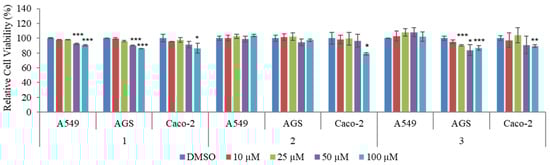 The effect of different concentrations of actinoquinazolione (1), 7-hydroxy-6-methoxy-3,4-dihydroquinazolin-4-one (2), and 7-methoxy-8-hydroxy cycloanthranilylproline (3) on cell viability of AGS, A549, and Caco-2. Cell viability was measured by using MTT assays. Data are presented as mean ± SD and analysis was performed by Student’s t-test (n = 3). * p < 0.05; ** p < 0.01; *** p < 0.001.