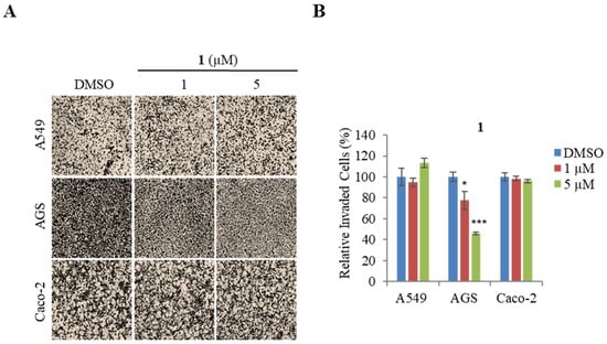 To confirm the concentration-dependent inhibitory effect of compound 1 on cancer motility, we evaluated invasion assays in A549, AGS, and Caco-2 cells. From the results (Figure 4A,B), 1 displayed a dose-dependent inhibitory effect on the invasion ability of AGS at concentrations from 1 to 5 μM, whereas the invasion ability of A549 and Caco-2 cells were not affected by treatment of 1. The results indicated that 1 has a higher suppression activity on the AGS invasion ability than A549 and Caco-2.