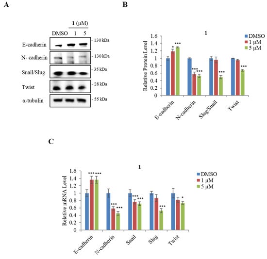 Cancer metastasis accounts for approximately 90% of cancer deaths [,]. A poor prognosis can be caused by the EMT, which is linked to metastasis []. E-cadherin is known to suppress cancer metastasis; the loss of its expression promotes the EMT markers E-cadherin, Snail, Slug, and Twist []. We assessed whether compound 1 decreased the motility associated with EMT by using qPCR assays and Western blot assays (Figure 5A). Based on the result, treatment with 5 μM of 1 significantly promoted the protein and mRNA expression level of E-cadherin in AGS cells (Figure 5B,C). Furthermore, the protein and mRNA expression levels of the EMT effector N-cadherin and the EMT transcription factors Snail, Slug, and Twist were decreased in AGS by treatment with 5 μM of 1 (Figure 5B,C).