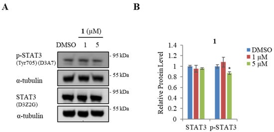 Previous studies have shown that STAT3 and EMT interact with each other to promote cancer metastasis. EMT is the downstream mediator of STAT3 and, therefore, the upregulation of the positive effect of STAT3 on the EMT process []. Western blot assays were performed to assess whether treatment with 1 affects the STAT3 protein level. The results (Figure 6A,B) indicate that 1 did not affect the total STAT3 protein level, whereas 5 μM of 1 slightly decreased the protein level of phosphorylated STAT3 (p- STAT3) in AGS cells.