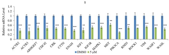 Finally, the Human Cell Motility RT2 Profiler PCR Array was used to examine the effect of compound 1 on the mRNA expression level of cell motility-related genes. The results (Figure 7) showed that treatment with 5 μM of 1 decreased the expression of ARP2/3 actin-related protein 2/3 (ACTR2/3), rho guanine nucleotide exchange factor (GEF) 7 (ARHGEF7), cell division cycle 42 (CDC42), V-crk sarcoma virus CT10 oncogene homolog (CRK), cortactin (CTTN), enabled homolog (ENAH), insulin-like growth factor 1 (IGF-1), insulin-like growth factor 1 receptor (IGF1R), mitogen-activated protein kinase 1 (MAPK1), Met proto-oncogene (hepatocyte growth factor receptor (MET), Phosphoinositide-3-kinase, catalytic (PIK3CA), rho family GTPase 3 (RND3), rho-associated, coiled-coil containing protein kinase 1 (ROCK1), Vimentin (VIM), WAS protein family 1 (WASF1), and walkout-Aldrich syndrome protein-like (WASL). These genes are related to cancer cell motility and could be used to treat cancer. ACTR2/3 regulates cell motility by playing an important role in actin dynamics and cytoskeleton organization []. The ARHGEF7 gene stimulates cancer cell motility and invasiveness by modifying the cytoskeleton []. CDC42 is as known a structural homolog of the Rho GTPase family; inhibition of CDC42 can reduce cancer progression by suppressing distinct GEFs []. CRK is a regulator of kinase and overexpression of CRK is associated with adenocarcinomas of the stomach []. CTTN is a regulator of actin polymerization by binding the actin-regulated protein complex ACTR2/3 []. ENAH includes a member of the ENAH/VASP family which can modify cell morphology and adhesion in the metastasis process []. IGF1 promotes cell proliferation by suppressing apoptosis in cancer []. MAPK1 is closely related to invasion and metastasis via modulated EMT []. The invasiveness and metastasis of aggressive cancer cells link to the overexpression of oncogene MET []. PIK3CA has been related to cancer cell motility, which is the second most frequent mutant oncogene. A statistical analysis showed that mutation of PIK3CA is the reason for more than 10% of cancer cases []. RND3 may serve as a predictor of EMT upregulation []. ROCK1 is a small GTPase Rho downstream effector that is crucial in cancer metastasis []. VIM has been related to cancer metastasis by promoting the EMT process []. WASF1, also known as WAVE1 (WASP family verprolin homologous protein 1), is associated with regulating actin cytoskeleton dynamics for cancer cell invasion and migration [].