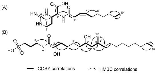 The COSY and TOCSY spectra provided insight into the structural components of two carbon moieties, as shown in Figure 2B: a propane unit and a linear carbon chain from well-defined proton connections. The chemical shifts of the terminal protons and carbons in the propane segment suggested the presence of amine and sulfonic acid groups. This deduction was corroborated by the mass fragment at m/z 138, confirming the identity as 3-aminopropane-1-sulfonic acid (3-APS) (Figure S9). Notably, this moiety was also recognized as tramiprosate (homotaurine), a compound under development as a potential treatment for Alzheimer’s disease []. The linkage of this moiety to carbonyl carbon at δC 177.6 (C-1′) was established through an HMBC correlation, and the oxymethine proton at δH 3.98 (C-2′) showed connectivity to the same carbonyl carbon. As shown in Figure 2B, the presence of the 2-hydroxy-4-methylpentane unit was revealed by the COSY and HMBC correlations. The position of the unit in the linear carbon chain was determined by the HMBC correlations of H-6′/C-4′ and H-6′/C-5′ and supported by the mutual correlations of both H-2′ and H-7′ with C-4′, C-5′, and C-6′ in the HSQC-TOCSY spectrum. Based on the molecular formula, the COSY and HMBC correlations, the remaining portion, excluding 3-APS, was identified as a 2, 7-dihydroxy-9-methyloctadecanoyl group. Unfortunately, the Mosher reaction for determining the configuration of C-2′ and C-7′ was unsuccessful. However, the relative configurations of C-7′ and C-9′ were deduced through J configuration analysis (JBCA), as depicted in Figure 5. The homo-/heteronuclear coupling constants were measured by DQFCOSY and HECADE spectra. Utilizing the non-equivalent proton positions on C-8′, the relative configurations of C-7′ and C-9′ were determined as 7S* and 9R*, respectively, based on heteronuclear coupling constants. Further support for this assignment arose from observing NOE cross-peaks of H-7′/H-10′, H-7′/H-19′, and H-8′a/H-19′ in the NOESY spectrum. Thus, compound 2 was elucidated to be 2′,7′(S*)-dihydroxy-9′(R*)-methyloctadecanoyl tramiprosate.