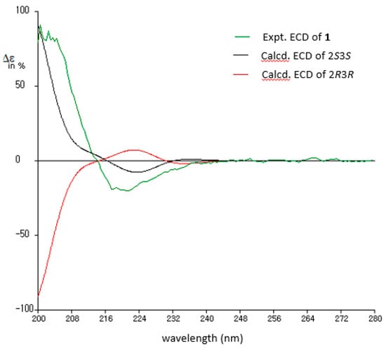 For the purpose of reducing the calculation time, the structure of compound 1 truncated at C-5′ was used. The conformational searches of the two isomers (2S3S and 2R3R) for the truncated 1 were performed by Spartan 20 software (Wavefunction Inc., Irvine, CA, USA) following a protocol reported in the literature []. The selected conformers were reoptimized at the m062X/6-31G(d,p) level with CH3OH solvent by using Gaussian 16 software (Gaussian inc., Wallingford, CT, USA). The ECD spectra of the conformers corresponding to the two isomers were calculated to the B3LYP//6-31G(d,p) level. A Boltzmann distribution for the optimized conformers was used for calculated ECD spectra.