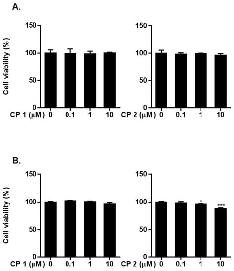 Cytotoxicity of 1 and 2 in LNCap (A) cells and RWPE-1 cells (B). Cells were treated with 1 or 2 (0.1, 1, 5, and 10 μM) for 24 h. Cell viability was determined by MTT assay. Results are presented as mean ± standard deviation (n = 3) * p < 0.05, *** p < 0.001 compared to non-treated controls.