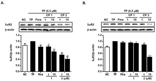 To evaluate the potential impact of 1 and 2 on BPH, we measured their inhibitory effects on the expression of 5α-reductase type 2 (5αR2). As shown in Figure 7, the expression of 5αR2 was induced by the treatment of TP in LNCap and RWPE-1 cells, and the pretreatment of cells with 1 or 2 (1 and 10 µM) significantly suppressed the 5αR2 expression. Particularly, compound 2 exhibited a more pronounced decrease in 5αR2 levels at the same concentration (Figure 7A,B). At the concentration of 10 µM, compound 2 decreased the expression level of 5αR2 protein induced by TP to 42% and 48% of TP-only treated cells in LNCap and RWPE-1 cells, respectively.