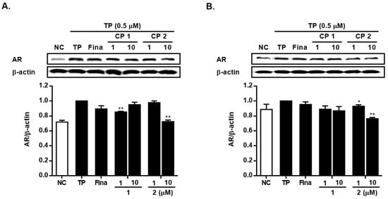 Inhibitory effects of 1 and 2 on the expressions of AR in LNCap cells (A) and in RWPE-1 cells (B). Cells were treated with testosterone propionate (TP, 0.5 μM) and 1 or 2 (1 and 10 μM) for 24 h. The expression levels of AR were analyzed by Western blotting. Results are presented as mean ± standard deviation (n = 3); p < 0.01 compared to the non-treated control (NC), * p < 0.05, ** p < 0.01 compared to TP-treated cells.