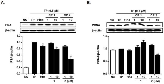 Inhibitory effects of 1 and 2 on the expressions of PSA in LNCap cells (A) and PCNA in RWPE-1 cells (B). Cells were treated with testosterone propionate (TP, 0.5 μM) and 1 or 2 (1 and 10 μM) for 24 h. The expression levels of PSA or PCNA were analyzed by Western blotting. Results are presented as mean ± standard deviation (n = 3); p < 0.01 compared to the non-treated control (NC), * p < 0.05, ** p < 0.01 compared to TP-treated cells.