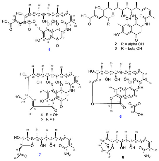 Structures of known compounds were identified as 34a-α-rifamycin W-M1-hemiacetal (2), 34a-β-rifamycin W-M1-hemiacetal (3) [9], rifamycin W (4) [17], protorifamycin I (5) [18], and saliniketal A (8) [19] by comparison of their spectroscopic data with those reported in the literature.
