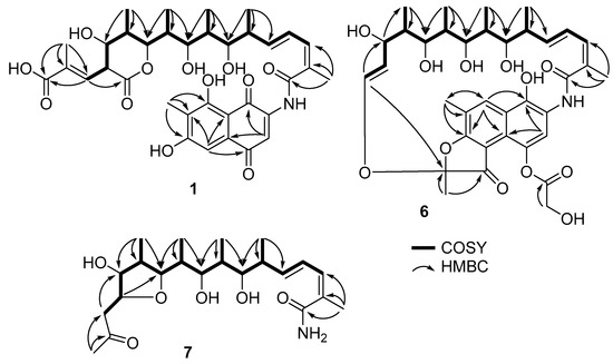 Key 1H-1H COSY and HMBC correlations for 1, 6, and 7.