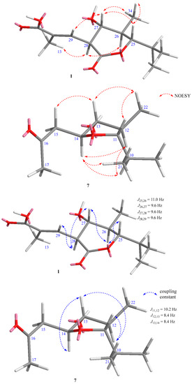 Key NOESY correlations and coupling constants for the lactone ring of 1 and tetrahydrofuran ring of 7.