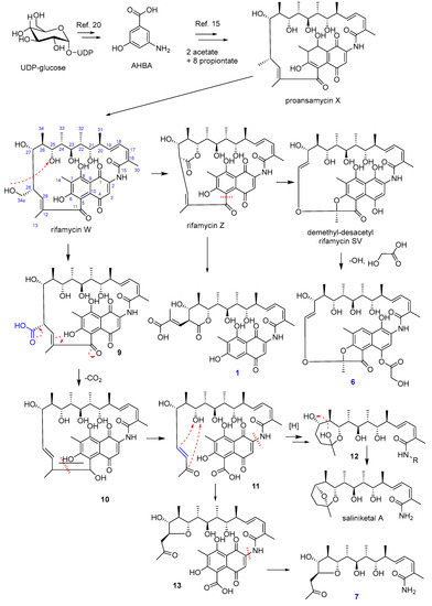 Rifamycins are a group of antimicrobial drugs, and their mode of action, resistance, and biosynthesis have been well studied [20]. Previous studies showed that the biosynthesis of rifamycins starts with 3-amino-5-hydroxybenzoic acid (AHBA) and chain extension by various rifamycin biosynthetic genes. The ansa-chain was established from two acetates and eight propionates [15]. Numerous structures of naturally occurring rifamycins are mainly due to the extensive post-PKS enzymatic tailoring conducted by enzymes encoded by pathway-specific genes [15]. Similarly, the possible biosynthesis pathway of the new compounds was proposed, as shown in Figure 4. Firstly, proansamycin X was synthesized, and then the compound was converted to rifamycin W. Rifamycin W was oxidized to rifamycin Z, and then this compound was converted to demethly-desacetyl rifamycin SV. Compound 1 could be originated from rifamycin Z by oxidation and decyclization at the C-5 position. Compound 6 could be synthesized from demethly-desacetyl rifamycin SV by deoxidation at C-8 and adding glycolic acid (from an acetate unit) at the C-4 position. The biosynthesis of 7 was proposed to be similar to saliniketals. Rifamycin W was converted to a percussor (11) via several steps, and 11 could be reduced and cyclized to give a tetrahydrofuran-containing derivative (13), and then the napthoquinone moiety was eliminated to yield salinifuran (7).