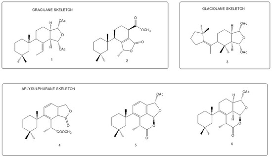 - Karuso, P.; Bergquist, P.R.; Cambie, R.C.; Buckleton, J.S.; Clark, G.R.; Rickard, C.E.F. Terpenoid Constituents of Morphologically Similar Sponges in the Family Aplysillidae. Aust. J. Chem. 1986, 39, 1643–1653. [Google Scholar] [CrossRef]