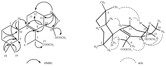 Deceptionin (7) gave a molecular ion adduct [M + Na]+ in HRESIMS at m/z 415.24591 which was consistent with the molecular formula C23H36O5 (theor. 415.24550) requiring six degrees of unsaturation (Figure S8). The 13C NMR spectrum (Figure S10) showed four resonances attributable to sp2 carbons (Table 1). In particular, quaternary carbon signals at 128.8 and 146.0 ppm accounted for a tetra-substituted non conjugated double bond (C-8/C-9) while two downfield shifted signals at 174.9 and 170.6 ppm were assigned to ester carbonyl groups, in agreement with the stretching band observed in the FT-IR spectrum at 1739.48 cm−1. In particular, the molecular ion peak [M − 60]+ observed in the ESIMS/MS spectrum suggested the presence of an acetyl group, while a deep interpretation of the GCMS spectrum allowed to infer the occurrence of a methoxycarbonyl function due to consecutive losses of MeOH and CO from the M-Me-AcOH fragment at m/z 317.23 (Figure S7). Hence, the three remaining formal unsaturations had to be assigned to cycles. A diagnostic methine carbon at 103.5 ppm (C-15), bearing a proton resonating as doublet at δ 5.87 (J = 2.5 Hz) in the 1H NMR spectrum (Figure S9), was indicative of an acetal function which fulfilled the number of oxygens required by the molecular formula. Starting from this latter proton, COSY and TOCSY correlations allowed to easily depict the spin system of the bicyclic substructure including a cyclohexene ring fused with a cyclic acetal (Figure 2). In fact, the acetal proton (H-15) was coupled to an allylic proton at δ 2.91 (dd, J = 8.1, 2.5 Hz, H-14) in turn coupled with a methine at δ 2.41 (H-13) (Figures S11–S12). This latter signal showed correlations in the COSY spectrum with one of the two protons of the oxygenated methylene C-16 at δ 4.09 (dd, J = 8.6, 5.6 Hz) and the proton signal at δ 1.26 of the methylene at C-12. The methylene H2-12 was coupled with the allylic methylene at C-11; thus, with the support of HSQC and HMBC data (Figures S13–S14) the planar structure of the bicyclic system was unambiguously assigned (Figure 3). The linkage with the remaining cycle was secured by the key HMBC correlation of the singlet methyl resonance at δ 1.08 (H3-20) with the olefinic carbon at 146.0 ppm (C-9) through the quaternary carbon at 41.4 ppm. The cyclohexane ring bearing two geminal methyl groups at δ 0.88 and 0.89 on C-4 was easily assigned by combining homo and heteronuclear correlation data. Finally, a bis-allylic methine quartet at δ 4.22 (J = 6.9 Hz, H-7) coupled to a methyl group at δ 1.24 (H3-6), connected the methoxycarbonyl function to the olefinic carbon at 127.6 ppm (C-8), thus completing the planar structural elucidation of the aplysulphurane skeleton of the new diterpene molecule 7 (Figure 3). The relative configuration of C-7 and C-10 was assumed to be the same as that reported for known aplysuphurane derivatives, whereas the stereochemistry of the bicyclic system was proposed by inspecting NOE experiments. In particular, the observed NOE between the methine protons H-14 and H-13 suggested a cis junction of the two cycles and the correlation of H-14 with Hb-16 indicated that they all lay on the same face of the molecular plane. On the other hand, the acetal proton H-15 showed NOE effects with both the methyl group H3-18 and the H-11a proton that was consistent with the orientation depicted in Figure 3 (Figure S15). A literature survey revealed that deceptionin NMR signals were similar to those of the methyl ester of pourewic acid A [52] (Table 1) from which it mainly differed in having an acetoxy instead of a methoxy acetal function at C-15. Interestingly, a compound with the same planar structure of pourewic acid A but opposite in sign optical rotation was reported by another research group [48] and the two compounds were suggested to be enantiomers [53]. NOE data recorded for deceptionin were consistent with those reported in [48], suggesting the relative configuration as depicted in Figure 2.