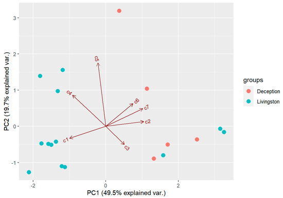 Biplot space of the first two principal components extracted in the PCA of the samples from the natural habitat. Deception = samples from Deception Island, Livingston = samples from Livingston Island. c1–c7=compounds 1–7 analyzed.