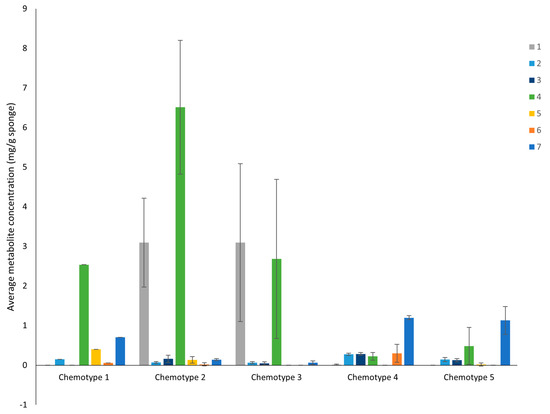 The relative abundance and dominance of the seven major metabolites within individual samples indicates that there are chemically distinct phenotypes within the D. antarctica populations of Deception and Livingston Islands. The samples were clustered according to the abundance of the metabolites and five chemotypes were identified in the natural habitat sponges (Figure 5). All Livingston Island samples but three were clustered into two different chemotypes (chemotypes 2 and 3). Chemotype 2 was characterized by the dominance of 4 and, to a lesser extent, 1, with trace metabolites 5 and 6. Chemotype 3 was characterized by the dominance of 1 over all other metabolites (Figure 6). The other three Livingston samples clustered with Deception Island samples in chemotypes 4 and 5. Chemotypes 1, 4 and 5 were characterized by higher abundance of 7, only a minor terpene in chemotypes 2 and 3. One sample from Deception conformed with chemotype 1, since it had only 2, 4, 5 and 7 and in different proportions than the other samples. The main difference between chemotypes 4 and 5 is the presence of 6 in chemotype 4, absent in chemotype 5 (Figure 7).