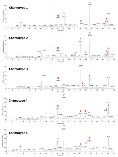 Representative chemical profiles of each chemotype for the natural habitat samples of D. antarctica. Main terpene derivatives 1–7 are reported. IS = internal standard.