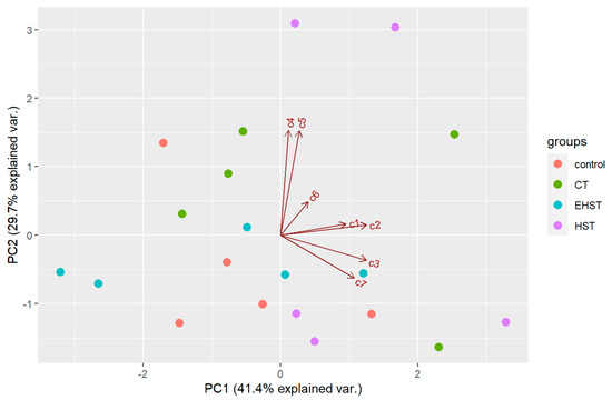 Biplot space of the PCA of the samples from the heat stress experiment. Control = natural habitat samples (Deception Island), CT = control temperature, HST = heat stress temperature, EHST = extreme heat stress temperature. c1–c7 = compounds 1–7 analysed.