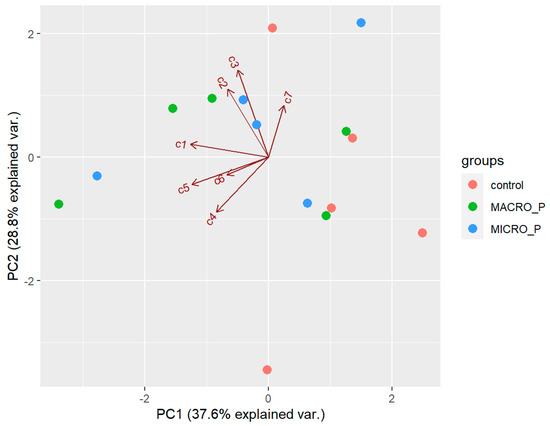 Biplot space of the first two principal components extracted in the PCA of the sample from the predation pressure experiment. Control = natural habitat samples (Deception Island), MACRO_P = samples exposed to macro-predation, MICRO-P = samples exposed to micro-predation. c1–c7 = compounds 1–7 analyzed.