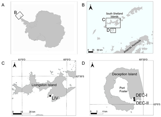 Location of the sampling sites. (A) Antarctic continent. (B) Tip of the Antarctic Peninsula and South Shetland Islands. (C) Livingston Island (South Shetland Islands). (D) Deception Island (South Shetland Islands). Sampling stations are marked with dots.
