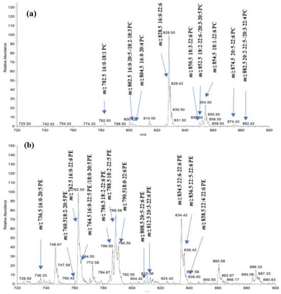 Mass spectra of each class of PhLs in salmon muscle tissue. (a) PC species identified in the positive mode at NL 183.1 accounting for the phosphocholine moiety; (b) PE species identified in the negative mode at precursor ion scan at 196.0.