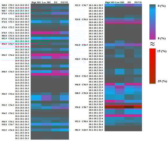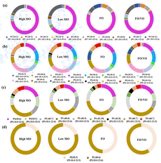 Meanwhile, the quantitative analysis for the total amount of each subclass of PhL was carried out and summarized in Table S2. Total amounts of PhL in salmon muscle fed high MO, low MO, FO, and FO/VO were 2.49, 2.86, 6.72, and 7.56 mg/g, respectively, showing high values in FO and FO/VO feeding. Among PhL subclasses, PE accounted for a higher proportion compared to other PhL groups (p < 0.05).