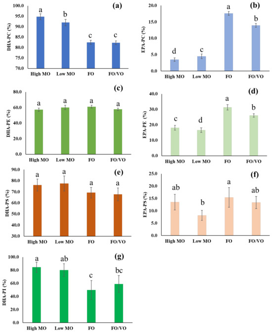 Changes of DHA- and EPA-containing PhLs in salmon muscle tissue on feeding four different diets. (a) DHA-containing PC (b) EPA-containing PC (c) DHA-containing PE (d) EPA-containing PE (e) DHA-containing PS (f) EPA-containing PS (g) DHA-containing PI. Data are mean ± s.d., n = 6. Values in each panel that have a different letter are significantly different (p < 0.05).