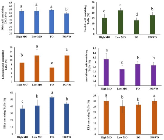 Alterations of oleic acid-, linoleic acid-, linolenic acid-, arachidonic acid-, DHA-, and EPA-containing TAGs in salmon muscle tissue when fed four different diets (High MO: high microbial oil; Low MO: low microbial oil; FO: fish oil; FO/VO: a mixture of fish and vegetable (canola oil). Data are mean ± s.d., n = 6. Values in each panel that have a different letter are significantly different (p < 0.05).