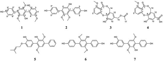 The unique marine environment, with its high pressure, low temperature and high salinity, leads to the generation of secondary metabolites with different marine fungi biological activities, which are an important source of natural products with pharmacological effects [13]. Recently, a fair number of p-triphenyl derivatives with novel structures and good biological activity have been found from the Aspergillus candidus that is widely distributed in marine environments [7,14,15,16]. Almost all of these marine-derived p-triphenyls have cytotoxic effects, but some have neuroprotective and antibacterial effects. For this reason, in the process of searching for new bioactive natural products from marine-derived fungi [17,18,19,20], we carried out chemical studies on A. candidus, a fungus from a marine sponge which was collected from the coast of Lingao County, Hainan Province. Two undescribed p-terphenyl derivatives, asperterphenylcins A–B (1–2), and two undescribed diphenyl ether derivatives, asperdiphenylcins A–B (3–4), together with three previously described p-terphenyl derivatives—4″-deoxyterprenin (5), terphenyllin (6), and 3″-hydroxyterphenyllin (7; Figure 1)—were isolated from the crude EtOAc extract of a solid-rice culture of the marine sponge-derived fungus A. candidus HM5-4. Based on the extensive biological activity of p-terphenyls, all compounds were screened for antifungal, cytotoxic and α-glucosidase inhibitory activities. In this paper, we discuss the separation, structure identification and biological activities of these obtained compounds in detail.