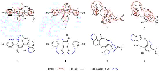 Key HMBC, 1H-1H COSY and ROESY(NOESY) correlations of compounds 1–4.