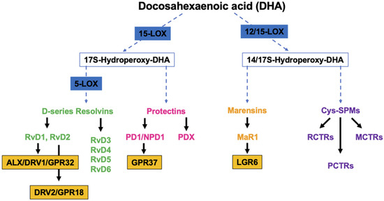 Overview of the pathways of the endogenous synthesis of specialized pro-resolving mediators (SPMs) from docosahexaenoic acid (DHA). LOX, lipoxygenase. Note that not all intermediates and enzymes are indicated.